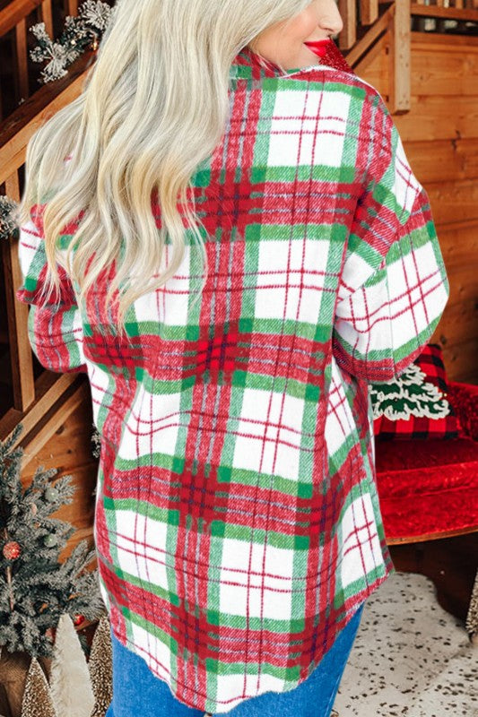 Turn heads in our chic and fuzzy Christmas plaid Shacket. Crafted from a soft, comfortable fabric, it’s perfect for layering on crisp days or a stylish twist to your everyday look.