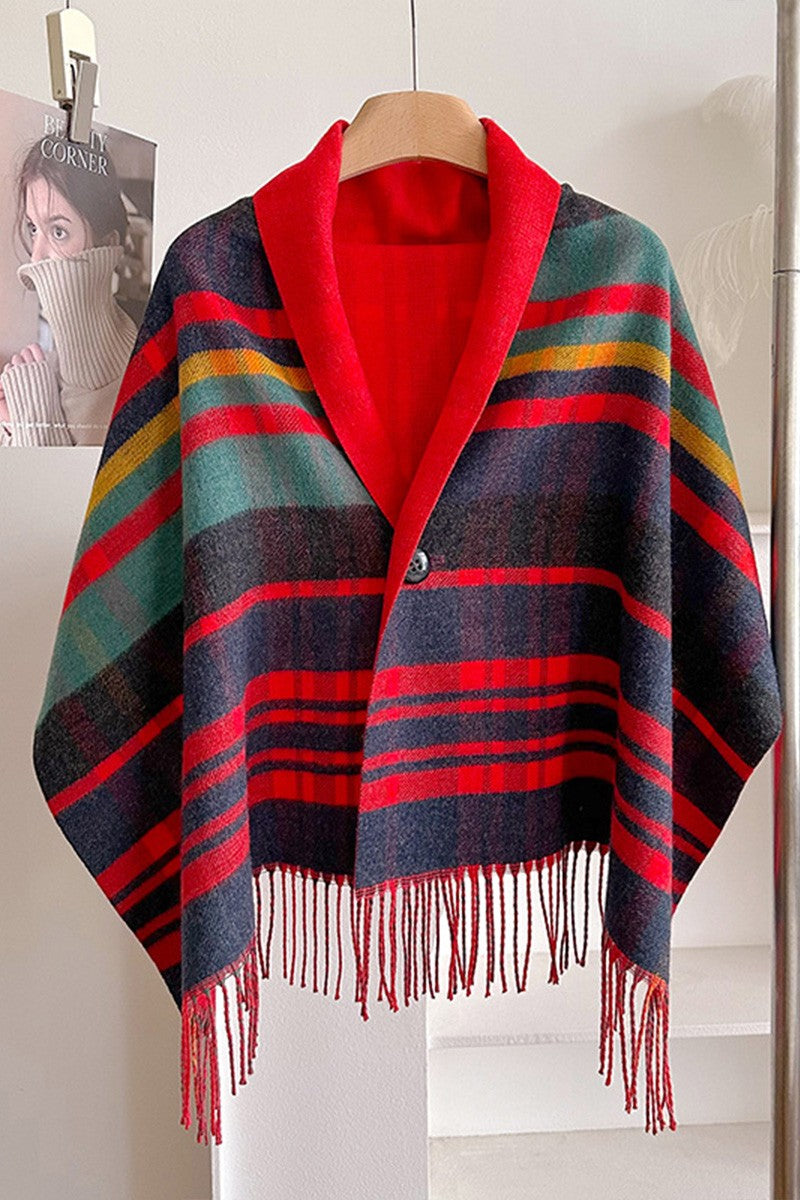 Elevate your look with this ultra chic (reversible) wool blend cape style shawl. This cape features modern fringe detailing, an overisezed button, and a timeless tailored silhouette. This piece is perfect for layering and transitioning from day to night.