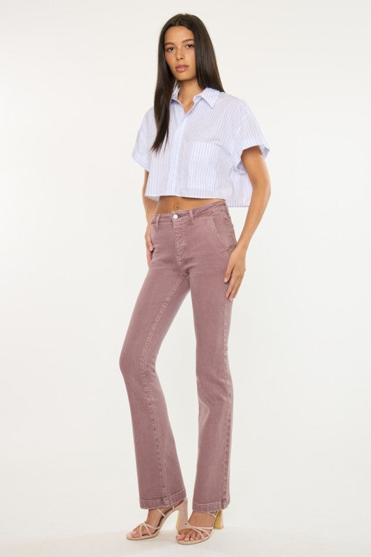 Mid rise bootcut trouser style jeans from KanCan.  This denim features minimal stretch, vintage wash, clean cut, zipper fly in a mauve color.